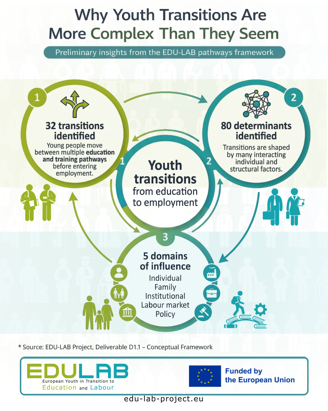 During its first year, the Horizon Europe project EDU-LAB – European Youth in Transition to Education and Labour developed a conceptual framework designed to provide a better understanding of how young people navigate education and training systems and ultimately enter the labour market. Deliverable D1.1 provides a systematic mapping of the different educational pathways, forms of transition and influencing factors that shape and structure these processes.