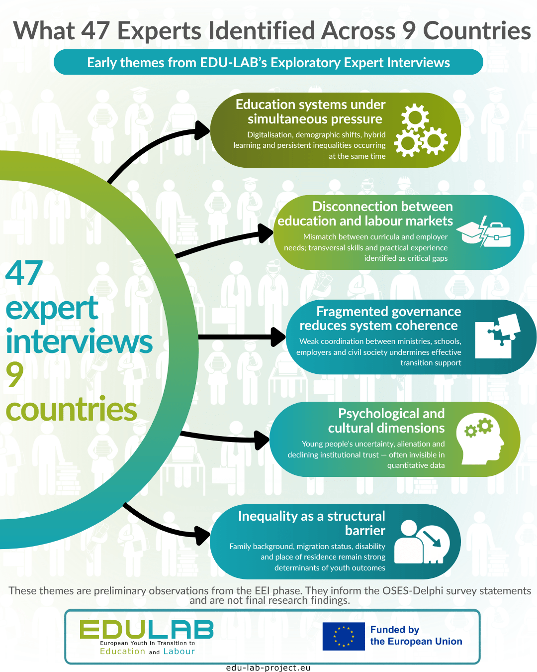 EDU-LAB’s Exploratory Expert Interview phase gathered insights from 47 specialists across nine countries. Their early observations are now shaping the first round of the OSES-Delphi survey on youth transitions in Europe.